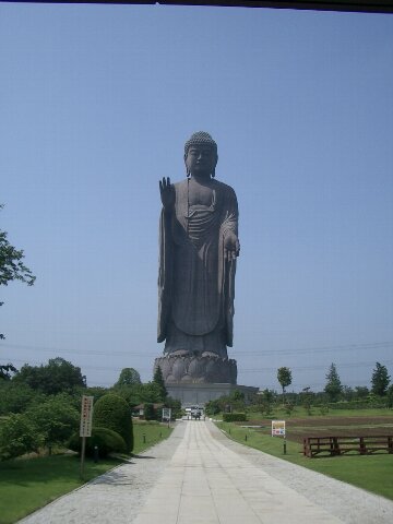 東大寺盧舎那仏像(奈良の大仏)が手の平に乗り、米国ニュージャージー州にある自由の女神像の約3倍と、他の像と比べても非常に大きい事が分かる。1989年に着工、1993年に完成した。施工は川田工業株式会社。鉄骨の構造物の表面に、中国で作られた6000分割の青銅の阿弥陀如来像を貼り付けて作られており、地上85mの胸の辺りまではエレベーターで上る事が出来る。(Wikipedia)